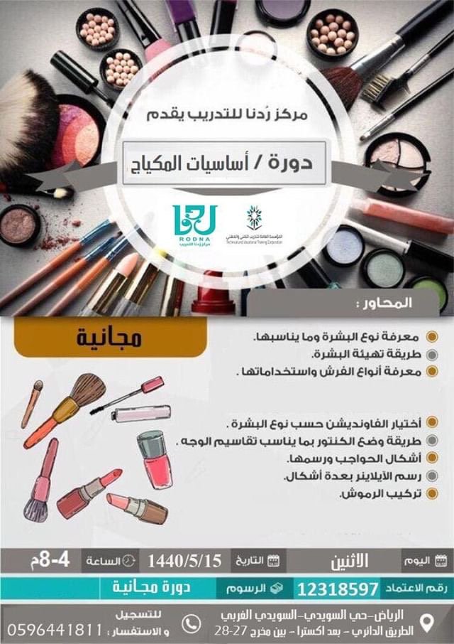 مركز ر دنا للتدريب On Twitter مركز ر دنا للتدريب فـرع السويدي يقدم دورة مجانية في مجال التجميل دورة أساسيات المكياج الاثنين ١٤٤٠ ٥ ١٥ للتسجيل واتساب ٠٥٩٦٤٤١٨١١ دورات الرياض تدريب